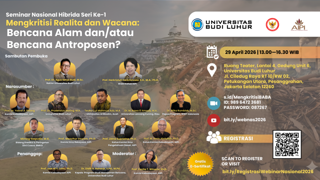 Bila kerancuan itu tetap terjadi dan kerusakan bumi Nusantara terus berlangsung, pengabaian atas sila-sila dalam Pancasila sebagai ideologi bangsa dan Negara Kesatuan Republik Indonesia merupakan hal senyatanya. Tata kelola kawasan yang semakin menjauh dari kaidah ilmiah, ekologi, dan kemanusiaan jelas menegasikan sila-sila “Kemanusiaan yang Adil dan Beradab”, “Kerakyatan yang Dipimpin oleh Hikmah Kebijaksanaan dalam Permusyawaratan Perwakilan”, dan “Keadilan Sosial bagi Seluruh Rakyat Indonesia”. Telah tibalah saatnya untuk membumikan dan menegakkan kembali ideologi Pancasila dalam pengelolaan kawasan demi ketangguhan bumi Nusantara, kemanusiaan, keadilan sosial, dan kesejahteraan masyarakat Indonesia di masa kini dan yang akan datang. Untuk itulah, kerancuan pemaknaan dan pemahaman publik, termasuk para pejabat berwenang dan pelaku penyebab terjadinya “bencana antroposen” amat perlu dihindari demi tegaknya ideologi Pancasila sebagai dasar kehidupan bernegara. Suatu analisis atas realita empiris dan wacana tentang “bencana” itu amat perlu untuk segera dilaksanakan secara kritis (lihat Analisis Wacana Kritis [Critical Discourse Analysis], misalnya dalam Blommaert dan Bulcaen 2000; Fairclough 2012). Pemilahan tentang makna kedua fenomena itu sekaligus pemahaman tentang keterlindanan keduanya amat urjen untuk disebarluaskan pada masyarakat luas. Tidak hanya perubahan pemahaman dan pemaknaan, tetapi juga perubahan budaya tata kelola kawasan yang amat beragam kondisi geologi-topografi-ekosistemnya amat diperlukan. Kehancuran lebih luas di bumi nusantara ini sudah saatnya dihentikan. Untuk itulah, Komisi Kebudayaan Akademi Ilmu Pengetahuan Indonesia (KK-AIPI) bermitra dengan sejumlah lembaga (Badan Pembinaan Ideologi Pancasila [BPIP] dan Universitas Budi Luhur) bermaksud menyelenggarakan suatu webinar nasional dalam mengkritisi realita empiris dan wacana tentang bencana.