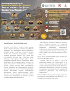 Dalam era antroposen dengan dampak aktivitas manusia yang signifikan terhadap ekosistem menyebabkan batas antara “bencana alam” dan “bencana akibat ulah manusia” (antroposen) semakin kabur. Tidak hanya batas dari realita dan pemahaman tentang kedua bencana itu semakin kabur, tetapi kombinasi keduanya bahkan dapat menimbulkan dampak yang dahsyat, yakni porak-porandanya relung hidup manusia dan makhluk hayati. Sejatinya, manusia dan makhluk hayati itu telah teradaptasi dalam ekosistemnya untuk jangka waktu lama yang kini ternyata menimbulkan konsekuensi tidak terduga, Apabila kombinasi kedua bencana itu tetap berlangsung, “kerentanan, kerusakan, dan kehancuran ekosistem” menjadi tantangan besar bagi bangsa Indonesia di masa kini dan masa depan.